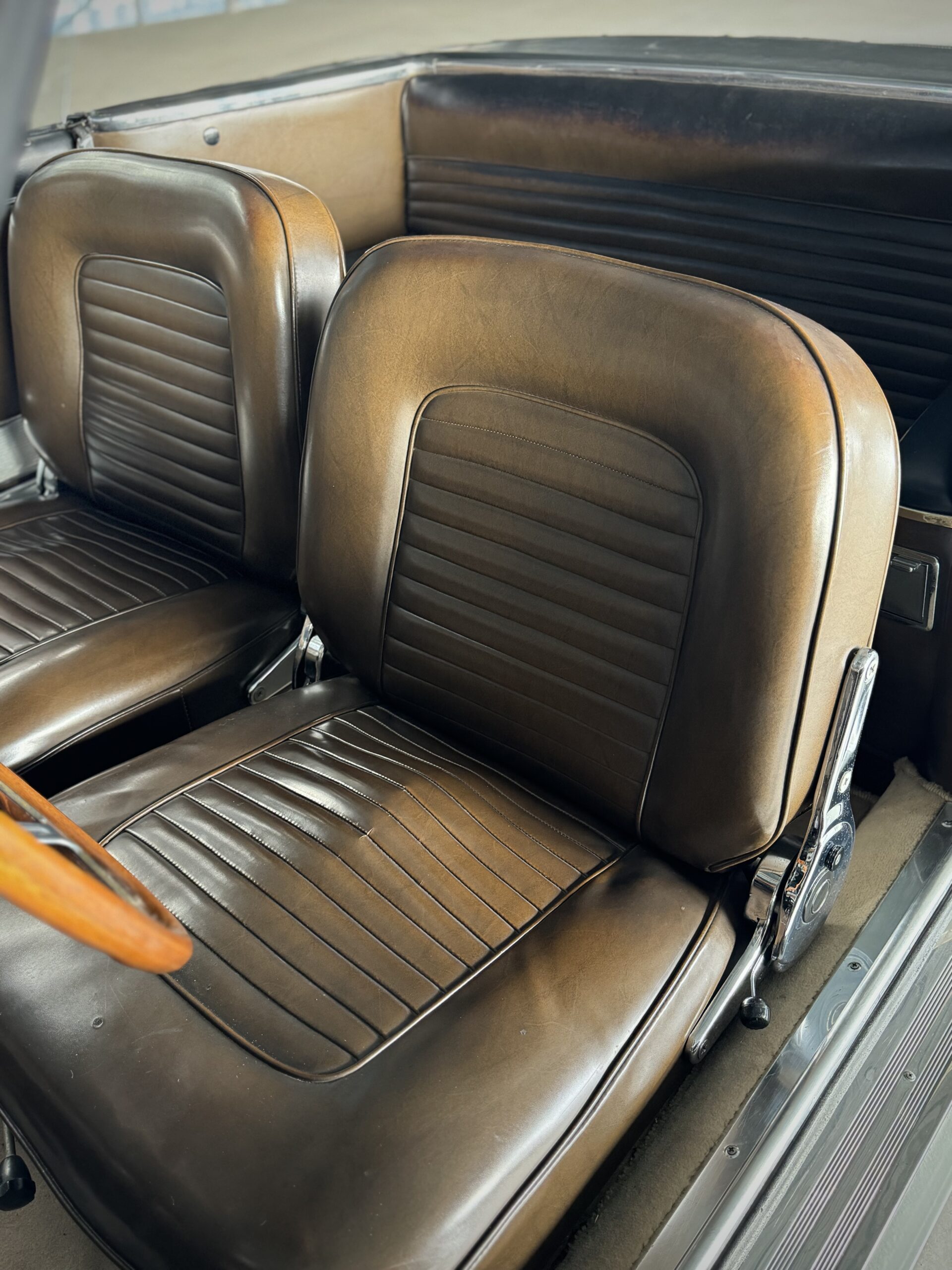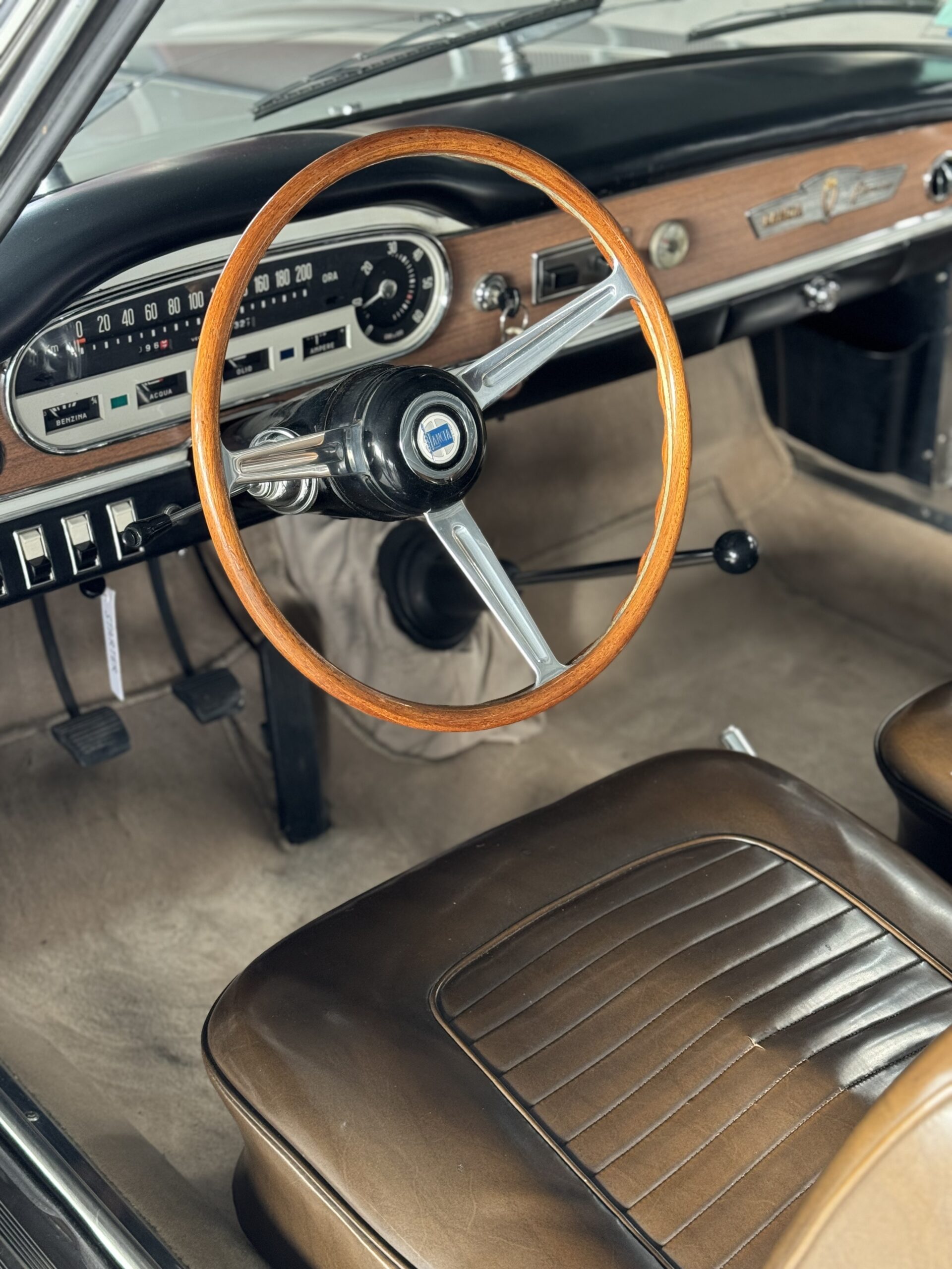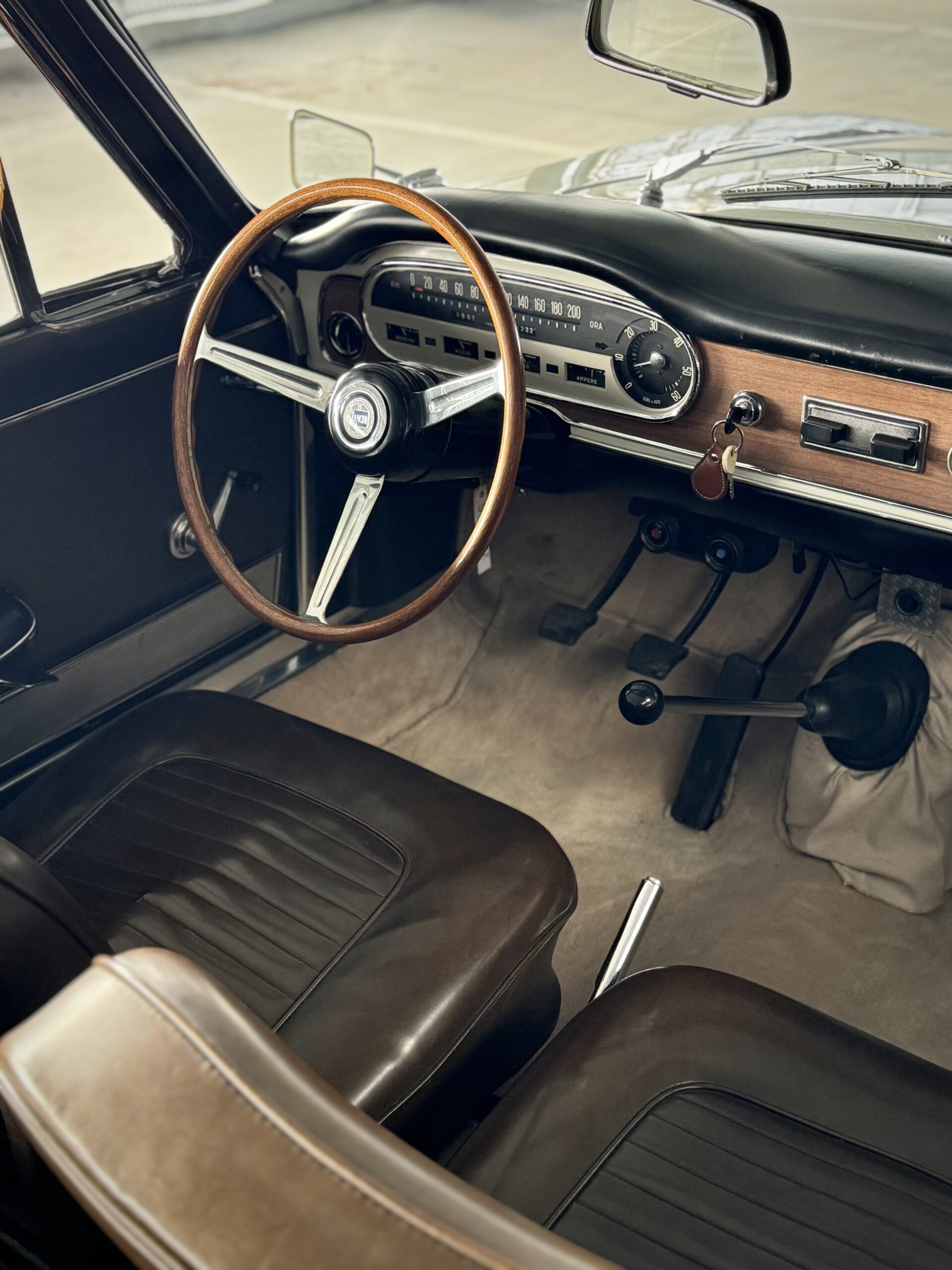 L’intérieur marron est en bel état, parfaitement conforme à l’esprit authentique du modèle. Les chromes sont également en bel état. Mécanique saine, conduite agréable et fidèle à l’expérience d’une véritable italienne des années 60. La revue technique d’époque est fournie avec le véhicule.